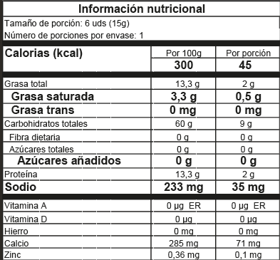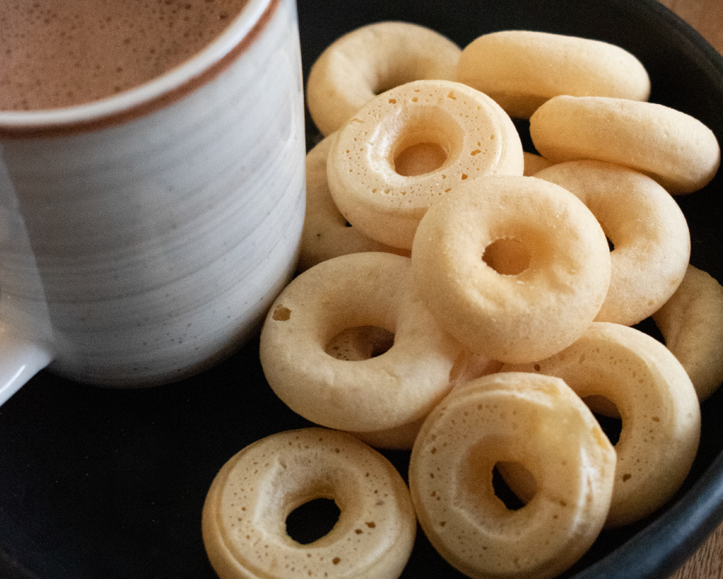Almidón de sagú, almidón de yuca, queso, huevo, levadura biológica (leudante natural), agua, cúrcuma (colorante natural).